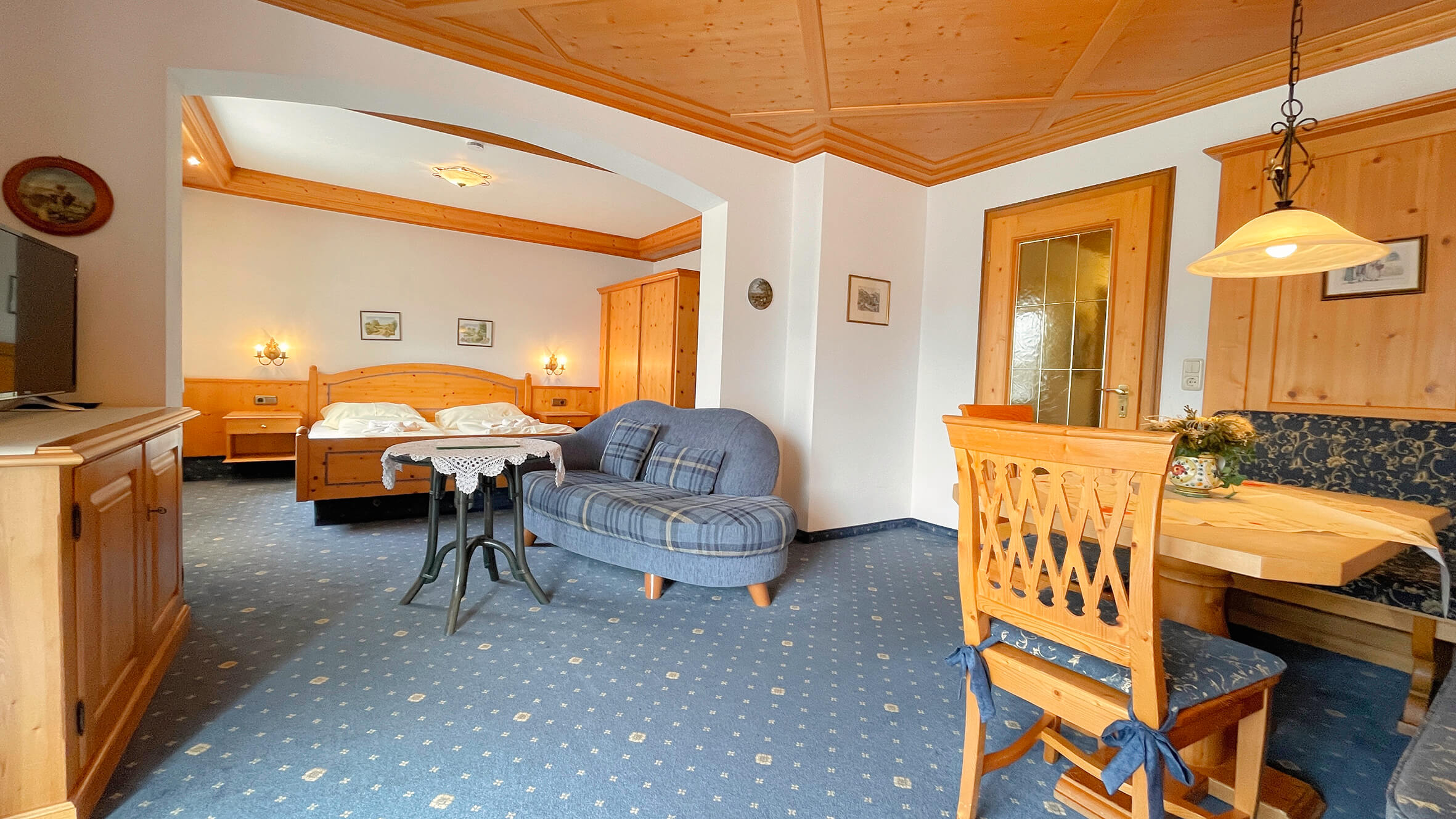 Ferienwohnung im alpenländischen Stil, mit Balkon, Dusche/WC, Fön, Safe, Sat-TV, Wohnbereich, Schlafzimmer.